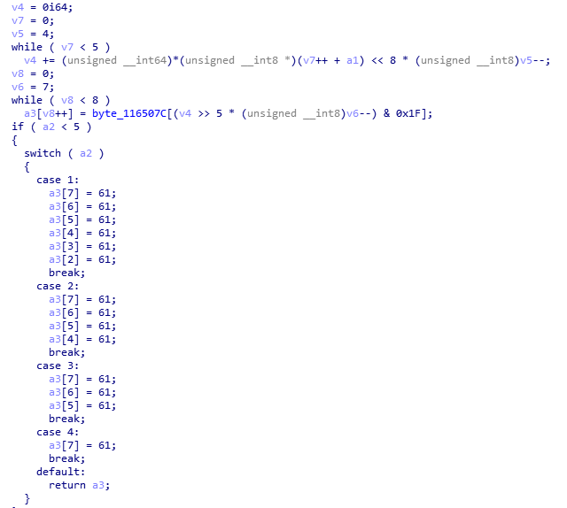 然后将eax和0x1F进行与运算,运算完,右移2位,然后继续运算,edx也会进行运算,其实它的本质就是将5个字符的二进制模式下拆成5份,然后再5份5份的读出转化为数字,然后在一个密码表里当做序号的值转化为密文。