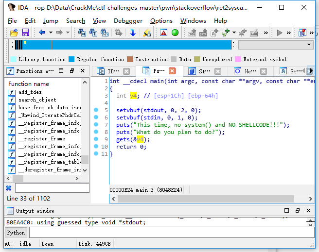 文件导入ida后,发现有system函数但是没有现有的"/bin/sh",所以需要通过gets函数在bbs中输入该字符串,然后跳转到system函数