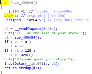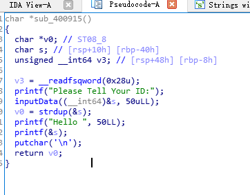 | printf("Please Tell Your ID:"); inputData((__int64)&s, 50uLL); v0 = strdup(&s); printf("Hello ", 50LL); printf(&s); putchar('\n'); return v0;