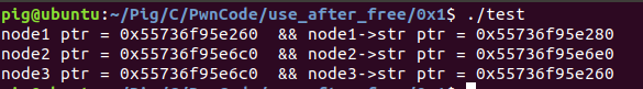 node3的str成员指向的是node1的x成员,free之后由于指针没有清0,所以chunk依旧可用,即node1依然正常使用,具体利用例子如下题