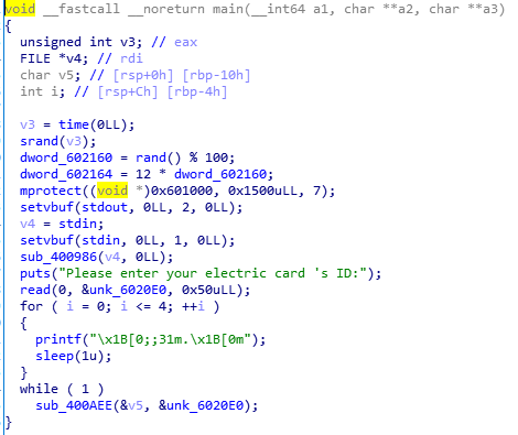 | void __fastcall __noreturn main(__int64 a1, char **a2, char **a3) { unsigned int v3; // eax char v4; // [rsp+0h] [rbp-10h] int i; // [rsp+Ch] [rbp-4h] v3 = time(0LL); srand(v3); dword_602160 = rand() % 100; dword_602164 = 12 * dword_602160; mprotect((void *)0x601000, 0x1500uLL, 7); setvbuf(stdout, 0LL, 2, 0LL); setvbuf(stdin, 0LL, 1, 0LL); sub_400986(); puts("Please enter your electric card 's ID:"); read(0, &unk_6020E0, 0x50uLL); //这里是将读入的数据写到bss段 for ( i = 0; i <= 4; ++i ) { printf("\x1B[0;;31m.\x1B[0m"); sleep(1u); } while ( 1 ) sub_400AEE((__int64)&v4); }