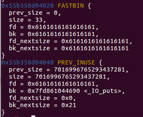 我们只需要写入40个’a’即可覆盖到PREV_INUSE的bk位置,bk位置恰好是__IO_puts,然后show一次就可以拿到libc了。